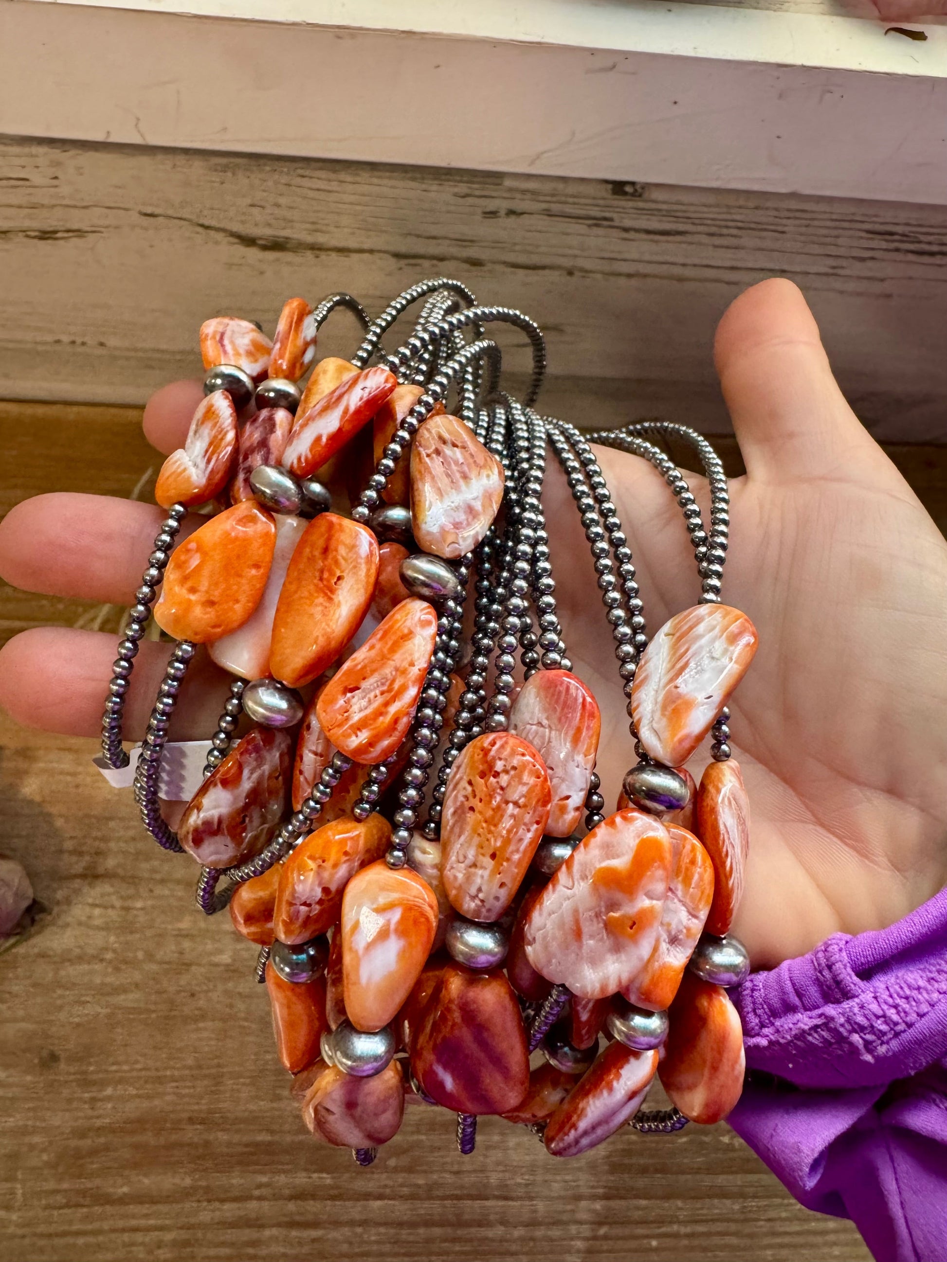 Three orange-toned spiny oyster beads on each side